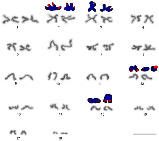 Thelyphonida: Thelyphonidae: Typopeltinae: Typopeltis guangxiensis, male karyotype, based on two sister metaphases II (Giemsa staining). Above standard karyotype shown NOR-bearing chromosomes (blue) from another two sister metaphases II (FISH, DAPI staining). One metacentric (no. 3) and two acrocentric pairs (nos 12, 15) each bear single terminal NOR locus (red). Another metacentric pair (no. 2) contains two terminal NOR loci (red). Scale bar = 10 μm.