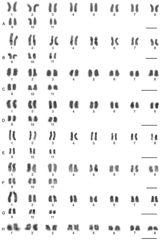 Schizomida: Stenochrus sp. (A), Olmecazomus brujo (B), Hubbardiidae (Cameroon) (C), Hubbardiidae (Seychelles) (D), Agastoschizomus lucifer (E), Notozomus sp. (F), Clavizomus sp. (G), Orientzomus sp. (Luzon) (H), male (B,F,G) and female (A,C–E,H) karyotypes. Based on mitotic metaphase (Giemsa staining). Scale bars = 10 μm.