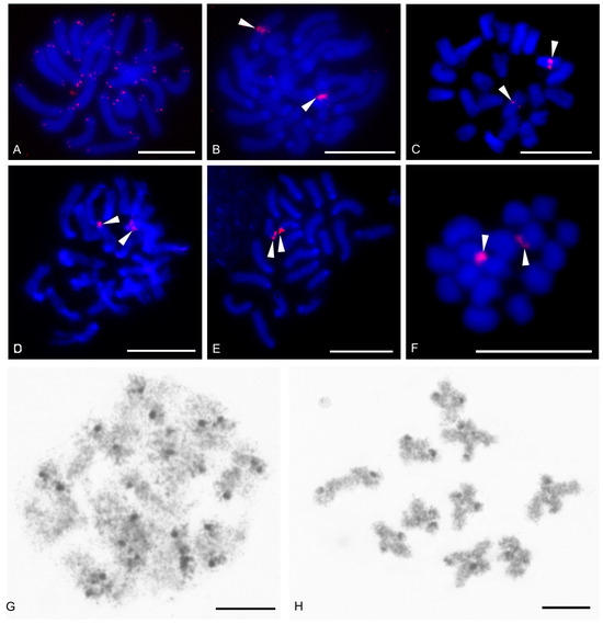 Schizomida: Stenochrus sp. (A), Olmecazomus brujo (B,G,H), Hubbardiidae (Cameroon) (C), Hubbardiidae (Seychelles) (D), Agastoschizomus lucifer (E), and Orientzomus sp. (Mindanao) (F), pattern of NORs, telomeric repeats (DAPI staining), and meiosis (Giemsa staining). Male (B,G,H) and female (A,C–F) plates. (A) Mitotic metaphase, visualization of telomeric repeats (red, FISH). (B–F) Mitotic metaphases, visualization of NORs (red, FISH). (B) One chromosome pair with interstitial NOR locus. All chromosomes exhibit DAPI-positive centromere region at one end. (C) One chromosome pair with interstitial NOR locus. (D) One chromosome pair with terminal NOR locus. (E) One chromosome pair with terminal NOR locus. Most chromosomes exhibit DAPI-positive centromere region at one end. (F) One chromosome pair with terminal NOR locus. (G) Diffuse stage, note considerable decondensation of bivalents except for centromeric regions (dark spots). (H) Incomplete diplotene showing ten bivalents. Each bivalent contains one chiasma. Note dark knobs formed by centromere regions. Arrowhead = NOR. Scale bars = 10 μm.