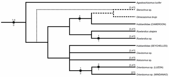 In contrast to the other supraordinal arachnid clades, tetrapulmonates are considered a monophyletic group with strong support (e.g., [5,28]). The interordinal relationships among other tetrapulmonate orders remain contested, however. Although amblypygids were initially considered to be the sister taxon of spiders [4,29,30,31], the Pedipalpi hypothesis, according to which amblypygids, schizomids, and thelyphonids are monophyletic, is more generally accepted by recent authors. According to this hypothesis, Amblypygi is sister to Uropygi, a monophyletic group comprising schizomids and thelyphonids [5,6,9,10,11,32,33,34]. Pedipalpi was not recovered by Pepato et al. [28] based on molecular data alone but was recovered by their combined analysis of morphological and molecular data [28]. Most recent analyses consistently recovered Uropygi [5,6,27,29,32,33]. However, mitogenomic data suggest Schizomida is the sister group of a clade comprising Amblypygi and Thelyphonida or the sister group of Amblypygi [35].