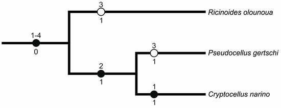 The phylogenetic placement of tetrapulmonates relative to other arachnids has long been debated. Tetrapulmonates were variously grouped with Palpigradi [4], the extinct paleozoic order Trigonotarbida [36], or Ricinulei [28,31]. Ricinulei, a relictual order that has existed since the Upper Carboniferous [37], comprises a single extant family including three genera and 103 species [38]. Molecular datasets have been used to analyze the internal phylogeny of ricinuleids [39,40,41,42]. Recent phylogenomic studies consistently supported the Arachnopulmonata hypothesis, according to which Tetrapulmonata is the sister group of Panscorpiones (Scorpiones and Pseudoscorpiones). This hypothesis was also supported by data suggesting genome duplication in the arachnopulmonate ancestor [8,43,44,45,46]. The phylogenetic position of arachnopulmonates relative to other arachnids remains unresolved, despite the use of genome-scale datasets [46]. Based on these datasets, Arachnopulmonata is placed, among others, with a clade comprising Solifugae, Ricinulei, and Xiphosura [10], a clade comprising Ricinulei and Xiphosura [47] or a clade comprising Ricinulei, Opiliones, Solifuges, Acariformes, and Parasitiformes [9].
