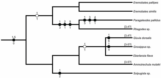 - Gainett, G.; Klementz, B.C.; Setton, E.V.W.; Simian, C.; Iuri, H.A.; Edgecombe, G.D.; Peretti, A.V.; Sharma, P.P. A plurality of morphological characters need not equate with phylogenetic accuracy: A rare genomic change refutes the placement of Solifugae and Pseudoscorpiones in Haplocnemata. Evol. Dev. 2024, 26, e12467. [Google Scholar] [CrossRef]