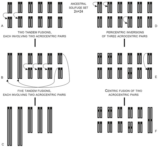 - Svojanovská, H.; Nguyen, P.; Hiřman, M.; Tuf, I.H.; Wahab, R.A.; Haddad, C.R.; Šťáhlavský, F. Karyotype evolution in harvestmen of the suborder Cyphophthalmi (Opiliones). Cytogenet. Genome Res. 2016, 148, 227–236. [Google Scholar] [CrossRef]