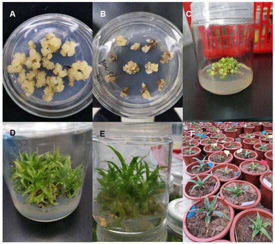 Pineapple callus treated with Agrobacterium transformed with the gRNA-AcACS1 vector and regenerated into seedlings. Where (A) represents embryogenic callus; (B) shows callus infected with Agrobacterium and cultured on callus-inducing medium containing 200 mg L−1 timentin and 20 µg L−1 hygromycin. (C–E) show callus differentiation into seedlings. (F) shows seedlings cultured in pots containing gardening soil.