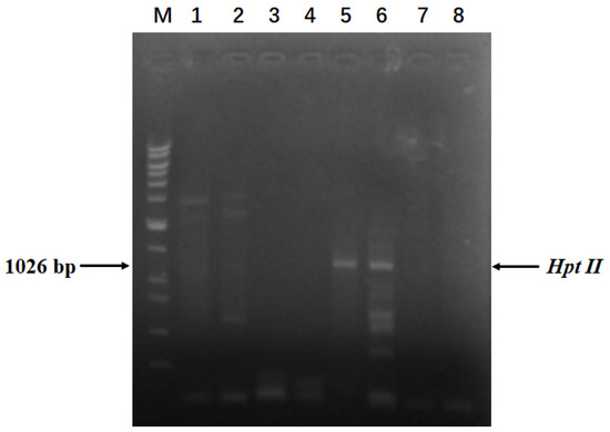 Pineapple embryogenic callus was transformed with Agrobacterium carrying the vector pC1300-Cas9-gRNATS1, pC1300-Cas9-gRNATS2, and pC1300-Cas9-gRNATS3 to pC1300-Cas9-gRNATS6, respectively, which were constructed as described in Materials and Methods (Figure 1). Genomic DNA was extracted from the leaves of seedlings regenerated from the transformed callus. The Cas9 vector used in this study [29] harbors a hygromycin-resistance gene (Hpt II), which was amplified and sequenced using the extracted genomic DNA as a template (Figure 2). After PCR products were electrophoresed and separated on a 1% agarose gel, plants showing a 1026 bp band were identified as transgenic plants. The DNA fragment containing the target sequence was also amplified using genomic DNA from the transgenic plants as a template and sequenced (Figure 3).