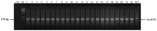 DNA fragments containing target sequences of AcACS1 amplified using genomic DNA isolated from TS1 mutants as templates. 1–24 represent different TS1 mutant seedlings. ‘CK’ refers to the non-template control. ‘WT’ refers to the wild-type plant. ‘M’ represents the DNA ladder. The molecular weights of the DNA ladder bands are 10 kb, 7 kb, 5 kb, 2 kb, 1 kb, 500 bp, and 200 bp, respectively.