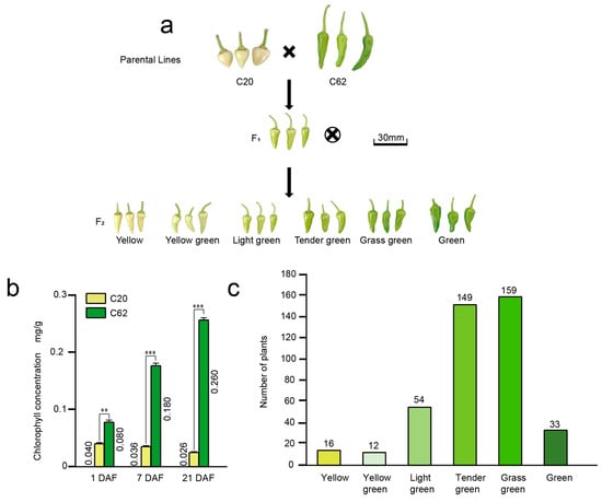 Segregation and chlorophyll content analysis in pepper fruits derived from a cross between parental lines C20 and C62. (a) Schematic representation of the cross between the yellow-fruited C20 and the green-fruited C62 parental lines, showing the F₁ generation and the color variation in the F₂ generation fruits (from yellow to green). Scale bar = 30 mm. (b) Chlorophyll content measured in fruits of C20 and C62 at three developmental stages (1, 7, and 21 DAF), showing a significant increase in chlorophyll levels in C62 compared to C20. Statistical significance is indicated (** p < 0.01; *** p < 0.001). (c) Distribution of fruit color phenotypes in the F₂ population, with a range of chlorophyll-related color classes from yellow to green.