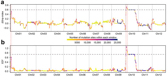 Genomic analysis of mutation sites across pepper chromosomes. (a) ΔSNP-index distribution across all 12 chromosomes, showing the relative differences in single nucleotide polymorphisms (SNPs) between two contrasting pepper lines. The x-axis represents chromosome position, while the y-axis shows ΔSNP-index values. The color gradient represents the number of mutation sites within each window, from yellow (lower mutation count) to dark blue (higher mutation count). Horizontal dashed lines indicate the significance threshold, and vertical dashed red lines highlight candidate regions with notable ΔSNP-index peaks. (b) ED2 distribution across all 12 chromosomes, indicating genetic differentiation between the two pepper lines. The x-axis represents chromosome position, while the y-axis represents ED2 values. The color gradient follows the same scale as in (a). Horizontal dashed lines represent the significance threshold, while vertical dashed red lines mark candidate regions with significant ED2 peaks.