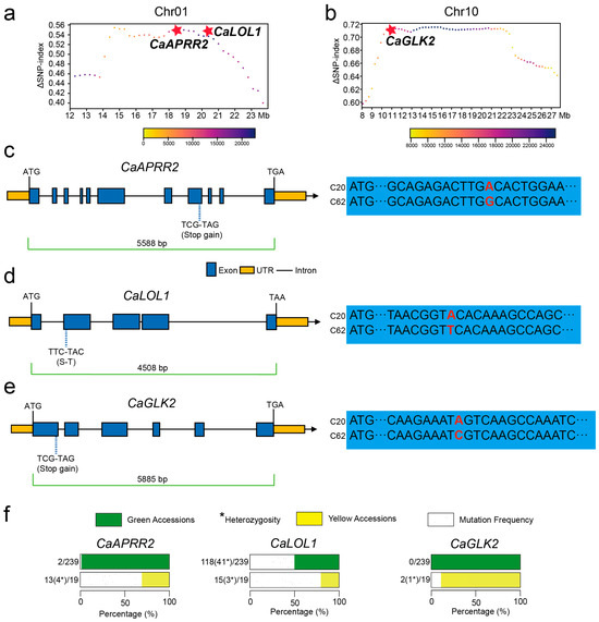 BSA mapping and structural analysis of candidate genes CaAPRR2, CaLOL1, and CaGLK2 associated with chlorophyll synthesis in pepper fruit. (a) ΔSNP-index plot of chromosome 1 showing the position of the chlorophyll-related gene CaAPRR2 and CaLOL1, marked by a red star. (b) ΔSNP-index plot of chromosome 10 indicating the location of the chlorophyll-related gene CaGLK2, also highlighted with a red star. (c) Structural diagram of CaAPRR2 gene, showing a premature stop codon mutation (TGG to TGA) causing truncated protein synthesis. The right panel shows the sequence alignment of CaAPRR2 in the C62 (green parent) and C20 (yellow parent) lines, with the mutation site highlighted. Blue boxes represent exons, yellow regions represent untranslated regions (UTRs), and black lines represent introns. The full length of the gene, including both introns and exons, is highlighted by a green line, spanning from the start codon to the stop codon. (d) Structural diagram of CaLOL1 gene, highlighting a non-synonymous mutation (TTC to TAC) resulting in an amino acid change from serine (S) to tyrosine (T). (e) Structural diagram of CaGLK2 gene, showing a premature stop codon mutation (TCG to TAG) causing truncated protein synthesis. The right panel presents the sequence alignment for CaGLK2 in the two parental lines, highlighting the stop-gain mutation. (f) Genetic variation in CaAPRR2, CaLOL1, and CaGLK2 in green and yellow accessions. The bar chart displays the genetic variation frequencies for three genes (CaAPRR2, CaLOL1, and CaGLK2) across green and yellow accessions, and heterozygosity is denoted by an asterisk (*). For CaAPRR2, yellow accessions exhibit a frequency of 13(4*)/19 (yellow bar), while green accessions show 2/239 (green bar). The mutation frequency is indicated as 2/239 (white bar for CaLOL1, green accessions have a frequency of 118(41*)/239, and yellow accessions exhibit a frequency of 15(3*)/19). CaGLK2 shows no variation in green accessions (0/239), whereas yellow accessions display a frequency of 2(1*)/19. Data are derived from a total of 258 materials.