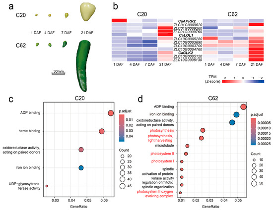 Comparative transcriptome and gene ontology enrichment analysis of parental lines C20 (Yellow parent) and C62 (Green parent) across four developmental stages. (a) Developmental stages of pepper fruit from parental lines C20 and C62, including 1, 4, 7, and 21 DAF. Scale bar = 30 mm. (b) Heatmap of transcript per million (TPM) expression values (Z-score) for candidate genes involved in chlorophyll biosynthesis and photosynthesis in C20 and C62 at four developmental stages. Higher expression levels are indicated in red, and lower levels in blue. (c) Gene ontology (GO) enrichment analysis of upregulated genes in C20, highlighting terms related to ADP binding, heme binding, oxidoreductase activity, iron ion binding, and UDP-glycosyltransferase activity. (d) GO enrichment analysis of upregulated genes in C62, with significant enrichment in terms related to photosynthesis, including photosystem I, photosystem II, and the photosystem II oxygen-evolving complex (in red), as well as additional molecular functions and cellular components associated with photosynthesis and cell organization. The size of each circle represents the number of genes in each category, and the color gradient indicates the adjusted p-value of enrichment significance.