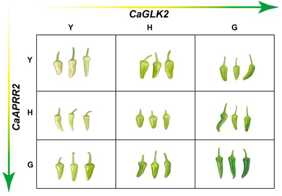 For genes CaAPRR2 and CaGLK2, the genotypes of the green parent, heterozygous, and yellow parent are designated as G, H, and Y, respectively. The F2 population fruits are classified into nine categories based on genotypes (Figure 5), resulting in nine different colors of pepper fruits. When both genes are of the C20 yellow parent genotype, the color is yellow, consistent with the phenotype of the C20 yellow parent. As the genotype of the C62 green parent gradually increases, the color of pepper fruits deepens, and when both genes are of the C62 green parent genotype, the color is green, consistent with the phenotype of the C62 green parent.