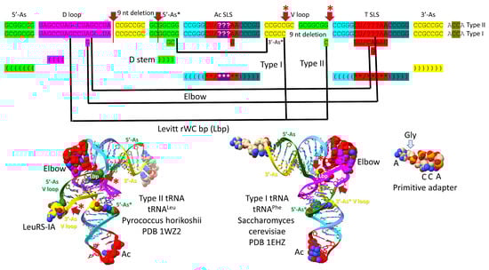 The major difference between type II and type I tRNAs is the variable loop (V loop). For type II tRNA, the sequence was initially a 3′-acceptor stem ligated to a 5′-acceptor stem (CCGCCGC_GCGGCGG) [5,32]. For type I tRNA, the V loop was initially CCGCC, processed from CCGCCGC_GCGGCGG by an internal 9 nt deletion removing GC_GCGGCGG. The type II tRNA V arm evolved to form a stem-loop-stem with a particular trajectory of the V arm from the tRNA body that is consistent within a synonymous tRNA set (i.e., in an Archaeon, there are 5 tRNALeu V arms with a common trajectory and similar sequence unique to tRNALeu and 4 tRNASer V arms with a common trajectory and similar sequence unique to tRNASer). Type I V loops contact residues in the D stem, explaining differences in type I V loops from the original CCGCC sequence. The 5′-acceptor stem remnant (5′-As*) common to both type II and type I tRNAs was formed by an identical internal 9 nt deletion on the complementary RNA strand (CCGCCGC_GCGGCGG→GGCGG by deletion of CCGCCGC_GC). So, a single internal 9 nt deletion process can account for both the more 5′- and 3′-9 nt internal deletions in type I tRNA. Because of complementary replication in pre-life, the strands on which 9 nt deletions occurred cannot now be known.
