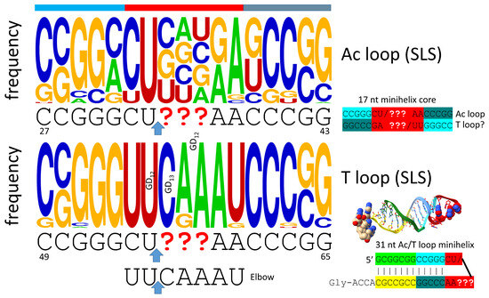 To correlate the tRNA structures to their root sequences, Figure 2 is shown. The entire tRNA sequence was formed from RNA repeats and inverted repeats (stem-loop-stems). Initially, the orderly process was a surprise because tRNA evolution had been proposed to have been chaotic [26,27,28,29,30,31]. The 7 nt 5′-acceptor stems and their 5 nt 5′-acceptor stem remnants were formed from 7 nt GCG repeats (GCGGCGG and after deletion GGCGG). The 3′-acceptor stems were formed from complementary 7 nt CGC repeats (CCGCCGC and, after deletion, CCGCC (the type I tRNA V loop)). The D loop was formed from a 17 nt UAGCC repeat. The anticodon and T stem-loop-stems had the initial 17 nt sequence ~CCGGG_CU/???AA_CCCGG. It is possible that the T stem-loop-stem initially formed from the complement of the anticodon stem-loop-stem (~CCGGG_UU/???AG_CCCGG). Ambiguity in the pre-life sequences arises because some of the nucleotides form the anticodon in tRNA, and the anticodon bases were scrambled in evolution to support coding. After LUCA (the last universal common (cellular) ancestor), the T loop sequence is known with confidence, but the T loop was strongly selected to form the tRNA “elbow”, where the D loop binds the T loop, so uncertainty about the pre-life 7 nt U-turn loop sequence (i.e., in 31 nt minihelices) remains at the anticodon base positions.