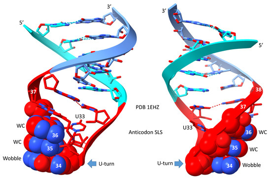The anticodon stem-loop-stem is shown in Figure 5. The anticodon loop (~CU/BNNAA) was indispensable for the evolution of tRNA and the genetic code. In the pre-life chemical evolution of life, the anticodon 7 nt loop with a U-turn between loop positions 2 and 3 was essential intellectual property. We posit that any attempt to replace this 7 nt U-turn loop with another RNA loop would have failed in evolution. An RNA loop of 3, 4, 5, 6, or 8 nt would certainly have failed. In the 7 nt U-turn loop, loop C1 interacts with loop A7 via a reverse Hoogsteen hydrogen bond. The interaction stacks the loop C1-A7 pair with the anticodon stem. Modifications to C1 (i.e., 2′-O-methyl-C; Cm) or A7 may affect this interaction [22]. The U-turn loop is a tight loop that would be expected to resist attacks by ribozyme nucleases in a pre-life world and, so, may have been strongly chemically selected. The C1-A7 pair and loop U2 set up the loop conformation to form the U-turn. The U-turn projects tRNA-34, tRNA-35, and tRNA-36 to form the 3 nt anticodon. Modifications of tRNA-37 contribute to the reading of tRNA-36. Apparently, wobbling at tRNA-36 was, in part, suppressed by modifications at tRNA-37. Wobbling at tRNA-34 cannot be suppressed in the same manner as tRNA-36, as described above.