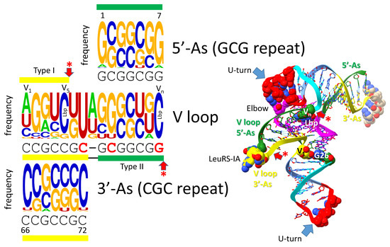 The type I V loop (3′-As*) initially had the sequence CCGCC but evolved typically to V1-AGGUC-V5 (Figure 7). V1 typically interacts with G26 or a substituted base. The type I V loop makes many interactions. GV2 can interact with GD3. GV3 forms a triplex base interaction with 22G that pairs with UD6 as part of the D stem. UV4 can flip away and not form interactions with other tRNA bases. These interactions are affected by tRNA modifications and sequences and may not be the same for every tRNA. Here, the PDB 1EHZ structure was considered [22]. CV5 forms the Levitt reverse Watson–Crick base pair to tRNA-G15 (GD8). Statistical tests strongly support the homology of the 3′-acceptor stem and 3′-As* (type I V loop), aligned as shown [3]. From the logos, the 5′-acceptor stem was clearly derived from a GCG repeat (typically GCGGCGG). The 3′-acceptor stem was clearly derived from its CGC repeat complement. It should be stressed that these clear sequence patterns and similarities have been preserved for ~4.2 billion years in tRNAs.