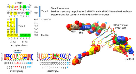 Alignment of type II V arms to type I V loops. The sequence alignment shows how type II V arms and type I V loops align with one another and their derivation from ligation of 3′- and 5′-acceptor stems. The tRNALeu (CAA) V arm of Pyrococcus horikoshii is shown [23,38]. Sequence logos of 105 14 nt archaeal tRNALeu V arms and 34 15 nt archaeal tRNASer V arms are shown. In Archaea, tRNALeu and tRNASer are discriminated by the following factors: (1) the distinct trajectory set point scores of the type II V arms (cyan asterisks); (2) the tRNALeu V6-UAG-V8 V arm-end loop sequence determinant for LeuRS-IA (red asterisks); and (3) SerRS-IIA binding the type II V arm stems of tRNASer with a trajectory set point score of one unpaired base (cyan asterisk).