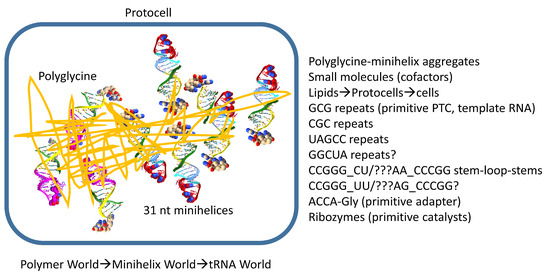 In the progression of RNAs of increasing complexity, GCG repeats, CGC repeats, UAGCC repeats, and stem-loop-stems were recombined into 31 nt minihelices (Figure 11). With ACCA-Gly attached, these 35 nt minihelices could have been used to synthesize polyglycine using a coevolved and mobile peptidyl transferase center that may first have arisen from GCG repeats. At some point, a primitive decoding center and the first mRNA-like molecules coevolved. We posit that polyglycine synthesis was the primary selective chemical driving force. As a molecular aggregator, polyglycine provided the major selection for pre-life chemistries leading to the first cells. As noted above, 31 nt minihelices may have been partly negatively selected against because of their long and very stable stems. This negative selection may have provided some of the impetus to evolve the first tRNAs, which did not include the longer stems that may have rendered minihelices difficult to unwind and replicate. Also, tRNA was positively selected because it is a molecule that can “teach” itself to code by duplication and repurposing in a pre-life environment.