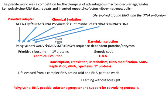We posit that, in pre-life, polyglycine was initially the main aggregator of macromolecules, lipids, and cofactors that would eventually form the first cells (Figure 10). Thus, polyglycine was the major driving force for chemical selection and coevolution of tRNAomes and translation systems. Sequence analysis of tRNA evolution shows that Polymer World progressed to Minihelix World, which progressed to tRNA World [3,42]. Until Darwinian selection was imposed at about the time of LUCA, however, Polymer World, Minihelix World, and tRNA World coexisted because there was no straightforward mechanism for the destruction of competitors. At LUCA, the first cells could largely consume and destroy Polymer World, Minihelix World, and many other outmoded pre-life chemistries. Evidence for Polymer World and Minihelix World, however, endures and is embedded in the tRNA sequence. Sequences of tRNAs include GCG, CGC, and UAGCC repeats (Figure 2). Clearly, pre-life Earth produced RNA repeats. GCG and CGC repeats are complementary to one another, indicating accurate complementary replication of RNA on a pre-life Earth. Formation of stem-loop stems (i.e., ~CCGGG_CU/???AA_CCCGG) also indicates complementary replication on pre-life Earth because a stem-loop-stem can act as a snap-back primer for complementary replication. ACCA-Gly is posited to be the primitive adapter molecule attached to RNAs on pre-life Earth (Figure 9). Ribozymes supported necessary catalysis. Polyglycine could be enriched as a primitive aggregator through interactions with the pre-life environment (i.e., ultraviolet light, amino acid incorporation errors (innovations), and other chemical reactions) (Figure 10).