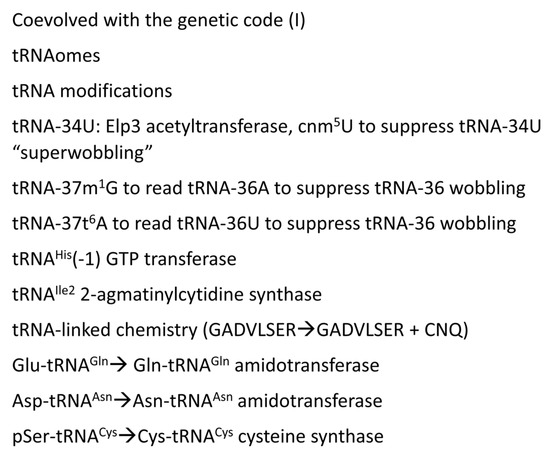 A model to describe the chemical evolution of the first cells is shown in Figure 11. There is no “chicken and egg” problem in the pre-life-to-life transition, and no supreme deity appears to be required. Phylogenomics and bioinformatics provide insight into the enzymes and cofactors that were likely present at LUCA [6,7,8,9,43,44,45]. Here, we attempt to correlate parts of that emerging analysis with inferences that are based on tRNA evolution, as recorded in conserved tRNA sequence. Figure 12, Figure 13 and Figure 14 provide lists of some of the tRNA modifications and protein enzymes identified for LUCA that we infer must have coevolved with the genetic code.
