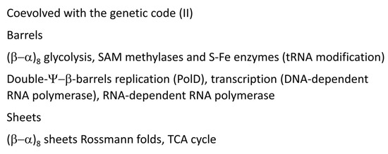 Figure 13 indicates protein barrels and sheets that support metabolism, DNA replication, transcription, and essential tRNA modifications. We have proposed that (β–α)8 barrels (i.e., TIM barrels; TIM for triosephosphate isomerase) were formed by a similar mechanism to tRNA in which multiple similar or identical RNAs were ligated for replication (Figure 1) [3]. Ligation of multiple βαβα encoding units resulted in (β–α)8 barrels, which were also refolded into (β–α)8 sheets (losing β7 in refolding). TIM barrels and Rossmann folds describe much of core metabolism. Double-Ψ–β barrels were formed similarly to (β–α)8 barrels by RNA ligation, in this case, from two RNAs encoding ββαβ units followed by folding into the barrel ββαβββαβ. Two double-Ψ–β-barrel-type enzymes describe DNA polymerase PolD in Archaea, which may be the first replicative DNA-dependent DNA polymerase [43,62] and also DNA-dependent RNA polymerases in all organisms [2,43].