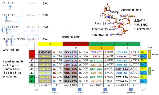 Column 4 of the code was the most favored column (tRNA-35C), explaining why glycine, the first encoded amino acid, occupies column 4, row 4 (BCC anticodon; the most favored anticodon) (Figure 16). Arginine occupies a six-codon sector of the code that was invaded by serine. It may be that ornithine was the initial positively charged amino acid that entered the code [77]. Ornithine can be converted to arginine in two steps. Ornithine is flexible, similar to lysine. Arginine is more rigid and forms strong ion pairs to aspartic acid, which are formed and broken in allosteric switching for many enzymes and proteins. Lysine entry into column 3 may relate to ornithine having been present in column 4 (i.e., initially, only a single CCU→CUU anticodon base change may have been required for ornithine or lysine jumping from column 4 into column 3).