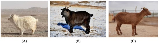 Cashmere goats with different coat colors. (A) White cashmere goat, (B) black cashmere goat, and (C) light brown cashmere goat.