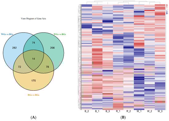 Figure 2A illustrates a Venn diagram depicting the shared and unique DEGs across the three coat color groups. The heatmap of gene expression patterns highlights distinct differences in gene expression among WGs, RGs, and BGs. The expression trends in the DEGs were strikingly different between WGs and BGs, whereas those in BGs and RGs were more similar (Figure 2B).