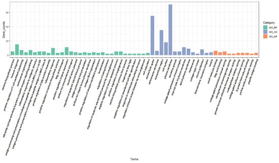 Differentially expressed genes (DEGs) were identified using the negative binomial distribution model in DESeq v2.0 []. Gene expression levels were compared among the three groups. The likelihood ratio test was conducted for hypothesis testing in the following comparisons: white vs. black cashmere goats (WGs vs. BGs), white vs. light brown cashmere goats (WGs vs. RGs), and black vs. light brown cashmere goats (BGs vs. RGs). Significant DEGs were defined as those with a fold change of ≥2.0 and a false discovery rate (FDR) of <0.05.