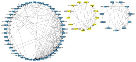By constructing a gene interaction network diagram using Cytoscape, we identified that the DEGs formed a primary network and two smaller sub-networks (Figure 4). Notably, one of the smaller sub-networks was associated with melanin synthesis which constituted and included genes such as TYRP1, TYR, DCT, ASIP, PMEL, LOC102180584, MLANA, TSPAN10, TRPM1, CLDN16, AHCY, LOC106503350, and LOC102175263 (Table 3). Gene interaction analysis of this sub-network unveiled inhibitory relationships among TYRP1, TYR, DCT, LOC102175263, and AHCY. Similarly, CLDN16, LOC106503350, and ASIP also exhibited inhibitory interactions. By contrast, TYRP1, TYR, DCT, TSPAN10, and TRPM1 promoted PMEL expression. This visualization underscores the complex relationships and interactions between genes involved in melanin synthesis and highlights their functional roles in influencing coat color.