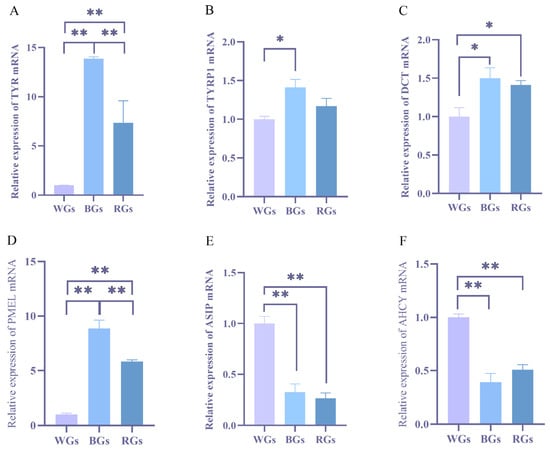 (A–F) represent the mRNA relative expression of TYR, TYRP1, DCT, PMEL, ASIP, and AHCY (n = 3). Data are presented as least squares means ± SEM. * denotes a significant difference at p ≤ 0.05; ** indicates an extremely significant difference at p ≤ 0.01.