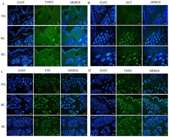 In melanosomes, melanin production begins with tyrosinase (TYR) catalyzing the oxidation of tyrosine to DOPA and subsequently to DQ. Further enzymatic reactions yield eumelanin, while cysteine, when present, interacts with DQ to form cysteine DOPA, which undergoes a closure and carboxyl group removal to yield pheomelanin [,]. In our study, qRT-PCR analysis revealed significantly higher expression of TYR, DCT, and TYRP1 in BGs than in WGs and RGs, which is consistent with findings in sheep with varying coat colors []. Immunohistochemical analysis demonstrated the presence of TYRP1 and DCT in the epidermis, outer root sheath of the hair follicle, and hair cortex, with TYR also expressed in the inner root sheath during the anagen phase. Natalia V. et al. observed that TYRP1 and DCT were also found in the outer root sheath and dermal papilla cells of mouse hair follicles during anagen []. This expression may be related to increased follicular melanogenesis (FM) during anagen, decreased FM synthesis during catagen, and the absence of FM during telogen []. Fluorescence signal intensity data were unveiled and confirmed the strongest signals for TYR, TYRP1, and DCT in BGs, correlating with elevated melanin levels in their skin and hair follicles.