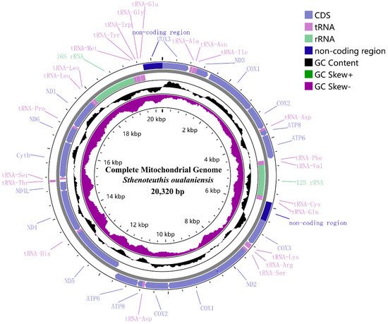 Genomic DNA was isolated from the body muscle tissue of a dwarf form of S. oualaniensis specimen using the TIANamp Marine Animals DNA Kit (TIANGEN, Beijing, China), in accordance with the manufacturer’s protocol specifically designed for extracting DNA from marine animal muscle tissue. The specimen and the extracted DNA have been stored at the Guangdong Provincial Key Laboratory of Fishery Ecology and Environment, registered under the voucher number SCS2017-S10-450. Genomic DNA samples, characterized by an A260/A280 ratio between 1.8 and 2.1, were utilized as templates for PCR amplification. DNA sequencing was conducted using an ABI 3730xl DNA automatic sequencer with genomic DNA as the template. The PCR primers were developed based on highly conserved regions of tRNA sequences from related species. Additionally, species-specific primers were designed as required, drawing from previously acquired sequence data [39] (Table S1). PCR amplification was carried out using TopTaq DNA polymerase (Qiagen, Hilden, Germany), following the manufacturer’s protocol with annealing temperatures varying between 45 °C and 55 °C. Sanger sequencing was conducted on the PCR products in both directions using the primer walking method to ensure comprehensive and accurate sequence coverage. The COI sequence from the dwarf form of S. oualaniensis served as the reference seed for iterative assembly using MITObim version 1.8 [40]. The mitogenome assembly and annotation were performed using SeqMan version 7.1.0, followed by manual verification [41]. Transfer RNA genes were predicted using tRNAScan-SE 1.21 via its online platform, utilizing the default search parameters and selecting “Mito/chloroplast” as the genetic source [42]. The mitochondrial genome of the species was mapped using assembly and annotation data. A diagram was generated through the GCView Server to effectively visualize the genomic information [43]. Nucleotide composition skewness was determined using the following equations: and [44]. The relative synonymous codon usage (RSCU) for the 13 protein-coding genes (PCGs) was calculated using MEGA software, version 6.0 [45]. This analysis provides insights into codon preference, which is essential for understanding genetic coding patterns and evolutionary adaptations within the mitochondrial genome. The mitochondrial genome of the dwarf form of S. oualaniensis was compared to that of the medium-sized form of S. oualaniensis, as documented in our previous study (MT661575) [46]. This comparative analysis aimed to identify differences and similarities in genomic features between the two forms, providing insights into their evolutionary relationship and potential species differentiation. Additionally, non-synonymous (Ka) and synonymous (Ks) substitution rates were calculated using DnaSP v6, offering valuable insights into the evolutionary dynamics of the mitochondrial genome [47].