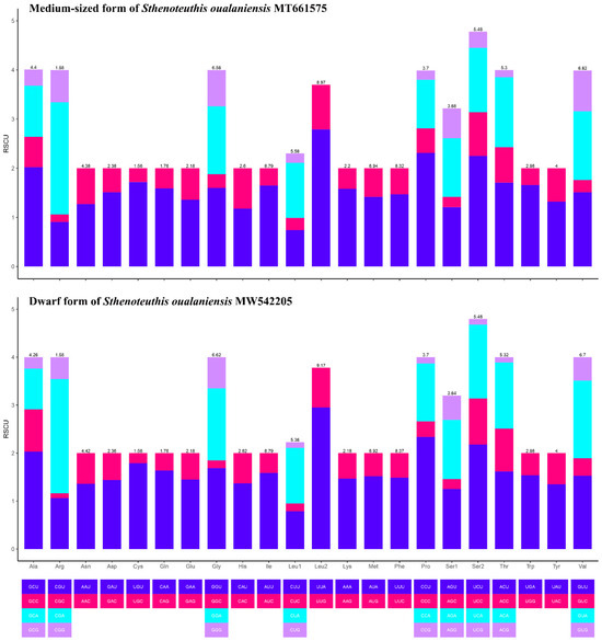 Relative synonymous codon usage (RSCU) patterns in the medium-sized and dwarf forms of S. oualaniensis.