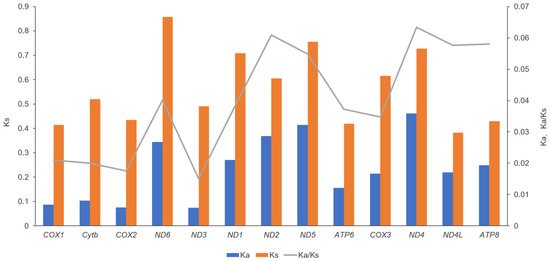 To investigate codon usage patterns and amino acid distribution, the amino acid composition and relative synonymous codon usage (RSCU) of the 13 protein-coding genes were analyzed in the mitochondrial genomes of both the dwarf and medium-sized forms of S. oualaniensis. This comparative analysis provides insights into codon preference and the functional implications of amino acid composition in these two forms. The RSCU analysis revealed that the mitochondrial genomes of both forms of S. oualaniensis exhibited the highest frequency for codons corresponding to the amino acids Leu, Ile, Phe, Met, Val, and Gly, while codons for Cys were less frequent (Figure 2). Two identical long non-coding regions (LNCRs), measuring 561 bp and 562 bp, respectively, were identified on the heavy (H) strand of the mitochondrial genomes in both the medium-sized and dwarf forms of S. oualaniensis. The first long non-coding RNA (LNCR) is situated in the region between the tRNA-Gln gene and the COX3 gene, whereas the second LNCR is found in the interval between the tRNA-Glu gene and the duplicate copy of the COX3 gene. These non-coding regions likely play critical roles in mitochondrial gene regulation, including DNA replication and transcription. The ratio of non-synonymous to synonymous substitution rates (Ka/Ks) was employed to evaluate the selective pressure acting on 13 protein-coding genes (PCGs) across the two forms of S. oualaniensis. The Ka/Ks ratios for all PCGs remained consistently below 1 (Figure 3), indicating strong purifying selection acting on these genes in both forms. Among the PCGs, ND4 exhibited the highest Ka/Ks value, suggesting a relatively faster evolutionary rate compared to other mitochondrial genes. In contrast, COX2 showed the lowest Ka/Ks values, highlighting significant selective constraints and slower evolutionary rates for these genes.