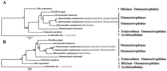 To ascertain the phylogenetic position of the dwarf form of S. oualaniensis, all available mitochondrial genomes from the family Ommastrephidae were retrieved from the NCBI database. This dataset included the mitochondrial genome of the medium-sized form of S. oualaniensis from our previous study [46]. Additionally, the mitochondrial genome of Architeuthis dux was used as an outgroup. Phylogenetic trees were generated using Maximum Likelihood (ML) and Bayesian Inference (BI) approaches, based on the nucleotide sequences from 13 protein-coding genes (PCGs). The phylogenetic analyses revealed congruent topological structures between the Maximum Likelihood (ML) and Bayesian Inference (BI) methods, strongly supporting the delineation of several clades based on the available data (Figure 4). The main clade consists of species from the genera Dosidicus, Eucleoteuthis, Sthenoteuthis, and Ommastrephes, all members of the subfamily Ommastrephinae. In contrast, the remaining clades include species from the genera Illex and Todarodes, which belong to the subfamilies Illicinae and Todaropsinae, respectively. The phylogenetic analyses revealed that the target species, the dwarf form of S. oualaniensis, and the medium-sized form of S. oualaniensis are clustered together as a monophyletic group. This clustering indicates that the two forms share a recent common ancestor and exhibit a closer relationship to each other compared to any other species within the Ommastrephidae family. All these results underscore the reliability of the available data in elucidating the evolutionary relationships among species within this family.