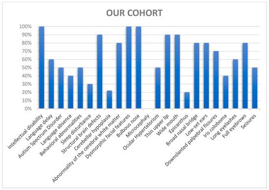Physically, all the patients exhibited distinctive craniofacial features, including down-slanting palpebral fissures, thick eyebrows, long eyelashes, ocular hypertelorism, low-set ears, a bulbous nose, a broad nasal bridge, a wide mouth, and a thin upper lip.