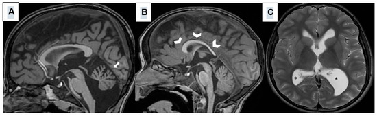 Sagittal T1-weighted (A,B) and axial T2-weighted (C) MRI images obtained from three different SHMS patients and showing hypoplasia/atrophy of the cerebellar vermis (white arrow); (A), thin and dysmorphic corpus callosum (thick arrowhead) (B), enlarged and asymmetric lateral ventricles (*) (C).