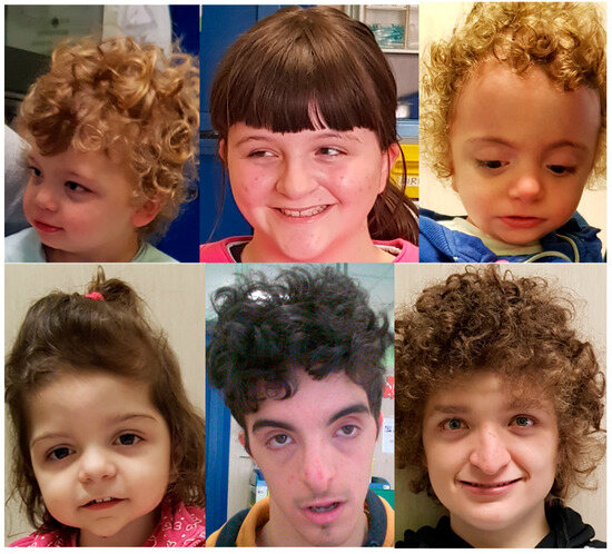 Regarding the presence of dysmorphic features, a significant percentage of our patients presented with iris coloboma (40% versus 9% in the Tenorio-Castaño et al. cohort). Conversely, none of our patients exhibited microcephaly (compared with 21% in in Tenorio-Castaño et al. cohort). In this case, the differences could be explained by the methodologies. To help physicians recognize the syndrome through its clinical features (Figure 3), we recommend focusing primarily on the specific association between ID and the presence of facial dysmorphisms, particularly down-slanting palpebral fissures, thick eyebrows, low-set ears, bulbous nasal tip, thin upper lip, and wide mouth (Figure 6). It is always advisable to check for the presence of iris coloboma too. In terms of neurodevelopmental management, we recommend longitudinal neuropsychological evaluation to assess cognitive and language abilities and emotional–behavioral profiles. A further MRI evaluation is suggested if behavioral symptoms worsen. When SHMS is strongly suspected, a direct test for the pathogenic c.607C>T variant should be proposed, perhaps with the use of a rapid PCR-RFLP strategy.