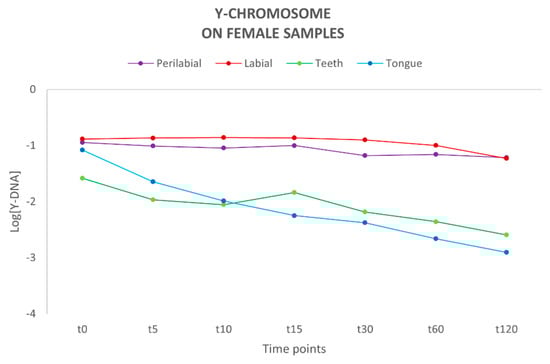 To assess the proportion of male DNA and its persistence, the [Y/Auto] ratio was calculated and subsequently converted to a logarithmic scale (Log) to normalise the distribution and ensure uniformity. For all samples in all analysed sites, a negative Y/Auto ratio was observed, indicating that the amount of female DNA exceeded that of male DNA. Considering the different time intervals, a flat linear trend was observed for the labial and perilabial sites, suggesting a reduced loss of male genetic material. In contrast, a different trend emerged for the curves representing the teeth and tongue, which exhibit a tendency toward a rapid decline over time (Figure 2). Such differences between these areas align with the absence of a physiological removal process for biological material on the external sites of the oral cavity, unlike the active removal mechanisms observed in internal sites.