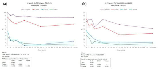Percentage of male autosomal alleles detected on female partner (a) and female autosomal alleles detected on male partner (b) in all collection sites (n = 10) at each time interval considered (min). Results of ANOVA for repeated measures (ANOVA = analysis of variance). vs = versus.