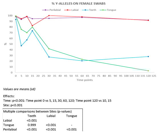 Following quantification using the Plexor HY System kit, the concentration of autosomal (total) DNA and Y-chromosome DNA was determined for each sample (Supplementary Tables S1 and S2). The autosomal DNA probe detects both male and female DNA, and thus it is not possible to distinguish the male component from the female one. Therefore, we focused on evaluating the quantity and persistence of Y-chromosome DNA on the female partner. Male DNA presence was observed up to 120 min after the kiss in all sites. The highest concentration of Y-DNA was detected at the labial and perilabial sites of the female partner, with a relatively constant trend over time, in contrast to teeth and tongue sites, where a decrease in genetic material was observed over time (Figure 1). A previous study by Kamodyová et al. [7] investigated the presence and persistence of DNA in mixed-saliva samples collected from the oral cavity following an intense kiss, detecting the presence of male DNA on female swabs up to 60 min post-contact.