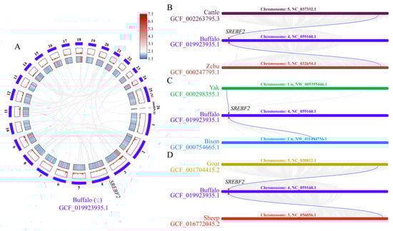 A collinearity analysis of the SREBF2 gene. (A) Collinearity analysis of SREBF2 in river buffalo, with chromosomes 1 to 24 marked (25 and 26 represent the X chromosome and mitochondrial DNA, respectively); gene density is represented by heat maps and line plots. (B) The collinearity of SREBF2 in buffalo, cattle, and zebu. (C) Collinearity of SREBF2 in buffalo, yak, and bison. (D) Collinearity of SREBF2 in buffalo, goat, and sheep.