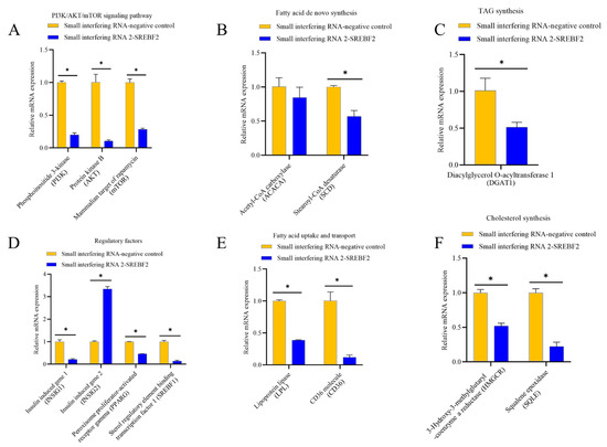 Comparison of the expression of genes involved in triglyceride and cholesterol synthesis following SREBF2 knockdown. (A) Expression levels of genes in the PI3K/AKT/mTOR signaling pathway. (B) Expression levels of genes involved in de novo fatty acid synthesis. (C) Expression levels of genes take part in triglyceride (TAG) synthesis. (D) Expression levels of genes that code for regulatory factors. (E) Expression levels of genes involved in fatty acid uptake and transport. (F) The expression levels of genes participating in cholesterol synthesis. “*” indicates significant differences (p < 0.05).