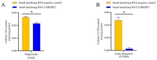 Decreased levels of TAG (A) and total cholesterol (B) in buffalo mammary epithelial cells following SREBF2 knockdown. “*” indicates significant differences (p < 0.05).