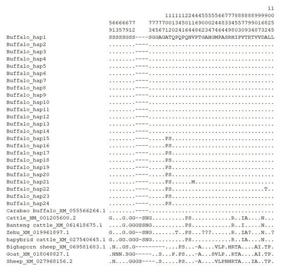 Amino acid sequence differences in SREBF2 between buffalo and other Bovidae species. The numbers correspond to the positions of amino acids in the mature peptide. A dot (.) denotes identity with the SREBF2 sequence, and amino acid substitutions are represented by different letters. Missing data are marked with a question mark (?). Horizontal line (-) represents a deletion in the sequences.