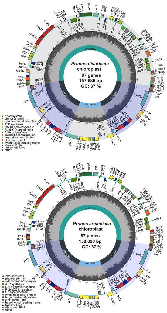 The chloroplast genome was assembled using GetOrganelle v.1.7.5, a process that was made possible by the clean data obtained from sequencing [28]. The complete chloroplast genome was reconstructed through a manual refinement process, leveraging the entire chloroplast genome of P. armeniaca (KY101151.1) as a reference sequence. This methodology was executed using the Geneious Prime online software platform (http://www.geneious.com/, accessed on 18 October 2024) [29]. Following assembly, the chloroplast genome was annotated using the Geseq online tool (https://chlorobox.mpimp-golm.mpg.de/geseq.html, accessed on 18 October 2024) [30]. The chloroplast genome was subsequently mapped using Chloroplot online software (https://irscope.shinyapps.io/Chloroplot/, accessed on 18 October 2024) [31].