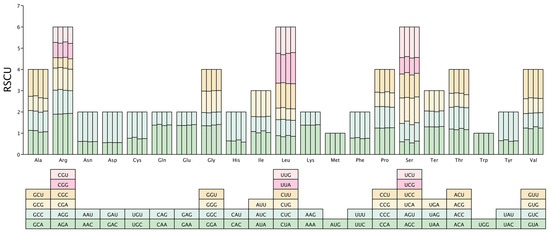 The computation of synonymous codon usage frequency for each coding amino acid in the chloroplast genomes of four wild Prunus species was executed using CodonW version 1.4.4 software [32]. The relative synonymous codon usage (RSCU) is determined by the comparison of the frequency of a specific codon within a coding sequence to its expectation frequency among a family of synonymous codons. RSCU values near 1.0 denote a lack of codon bias, indicating that all synonymous codons are used with equal frequency. Conversely, RSCU values exceeding 1.0 indicate a codon bias, suggesting that a particular synonymous codon is favored and used more frequently than the average, thus deviating from the general usage pattern [33].
