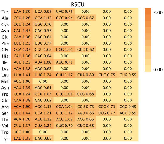 The codon usage frequencies within the chloroplast genomic sequences of four wild Prunus species investigated. The hues depicted in the figure correspond to the RSCU values, with codon usage frequencies escalating progressively from light yellow to orange.