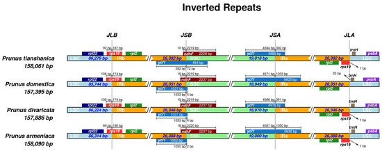 Regions that are inverted repeat (IR) show a high degree of conservation among chloroplast genes; however, the main mechanisms causing the size of the genome-wide change in angiosperm chloroplasts are thought to be the expansion and contraction of IR boundaries. We used the online software IRscope (https://irscope.shinyapps.io/irapp, accessed on 20 October 2024) to visualize the expansion and contraction of the IR region over the whole chloroplast genome of four wild Prunus species [34].