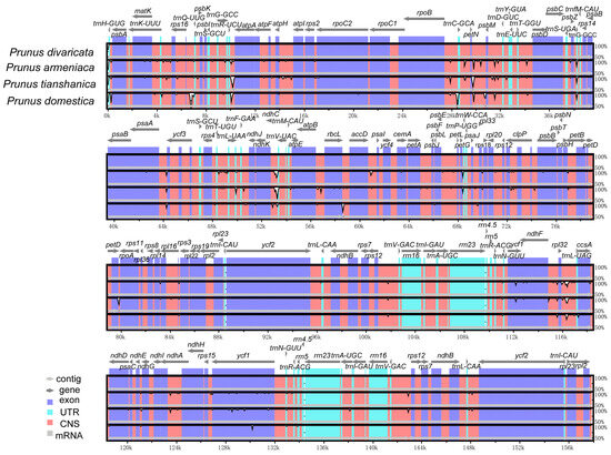 Subsequent sequence identity plots depict the chloroplast genome sequences of four wild species within the genus Prunus. The orientation of the genes is indicated by the grey arrows; non-coding sequences are denoted by red bars, exons by purple bars, and introns by blue bars. The vertical scales indicate percentage identity in the range of 50% to 100%.